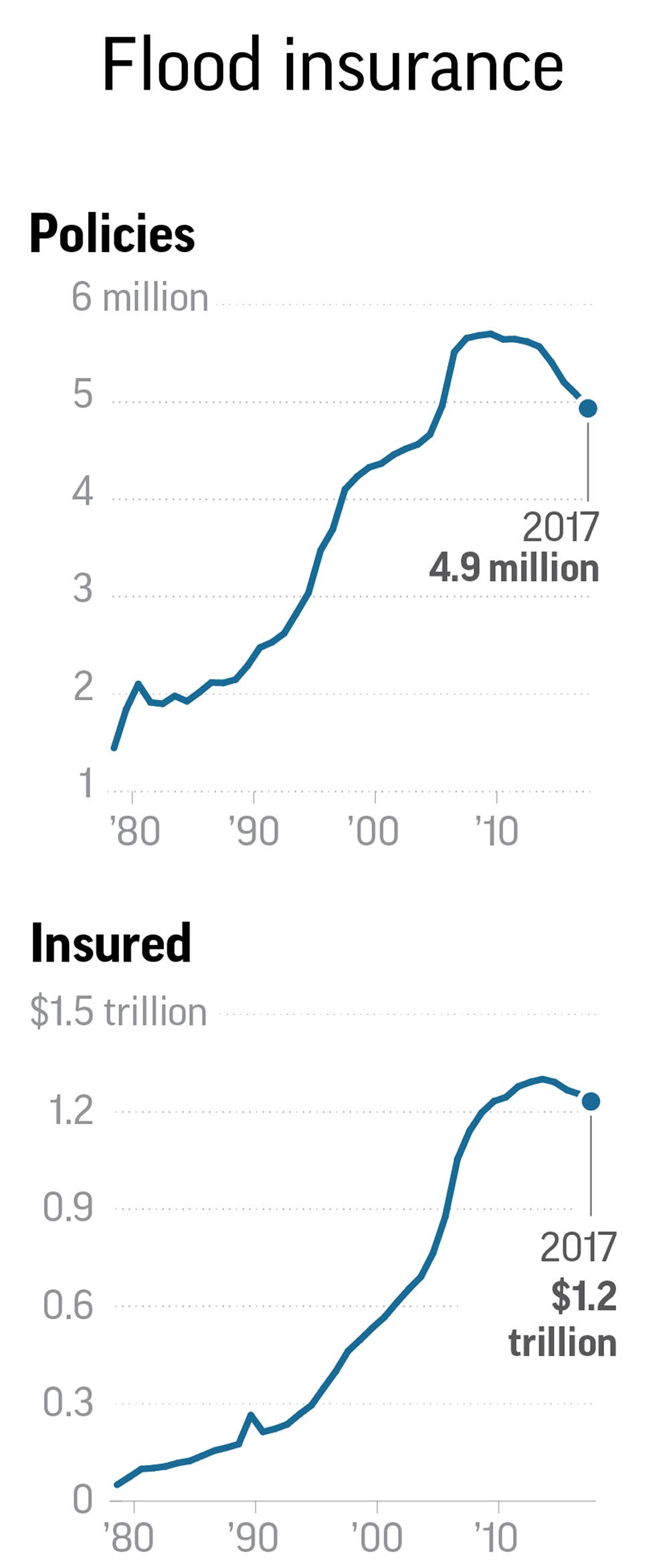 What's driving the drop in policies? Congress approved a price hike, making premiums more expensive, and maps of some high-risk areas were redrawn. Banks became lax at enforcing the requirement that any home with a federally insured mortgage in a high-risk area be covered. Memories of New Orleans underwater in 2005 after Hurricane Katrina have faded.