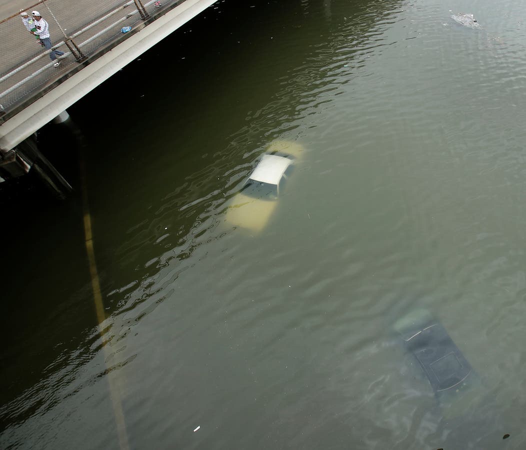 Cutline: A car is submerged on a freeway flooded by Tropical Storm Harvey on Sunday, Aug. 27, 2017, near downtown Houston, Texas. The remnants of Hurricane Harvey sent devastating floods pouring into Houston on Sunday as rising water chased thousands of people to rooftops or higher ground.