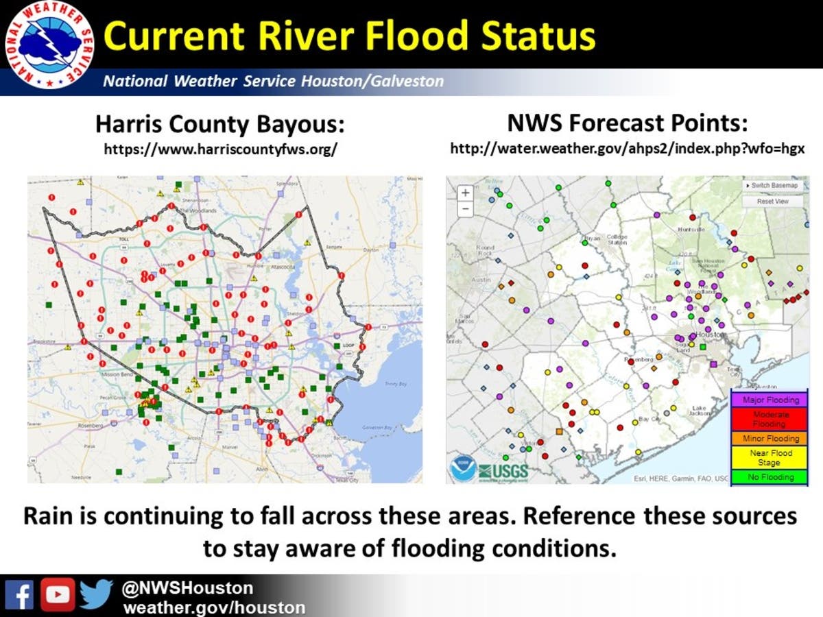 The National Weather Service shares in a recent Tweet the latest on flood status, adding a reminder to locals to not drive into or near flood waters for spectating. "Rescues are underway and do not need additional obstructions," the agency tweeted.