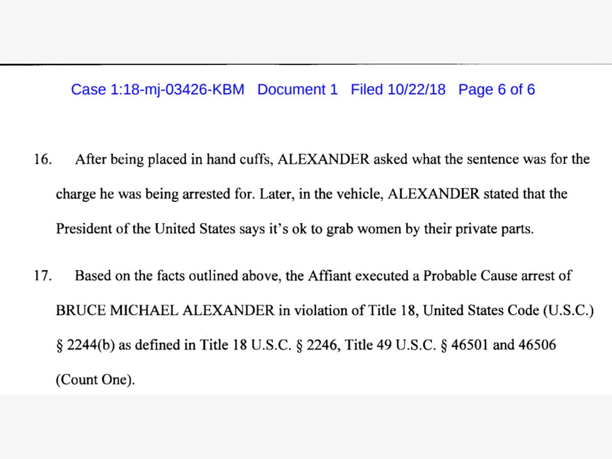 Alexander had not been drinking and had not taken any sleep aids, court documents state. Alexander allegedly made the comment regarding Trump after he was arrested and in a law enforcement vehicle.
