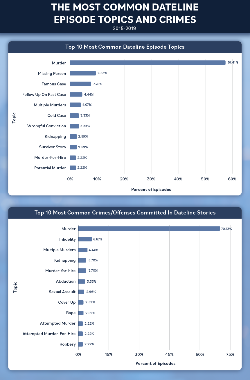 Along with the most featured states came some other interesting statistics about the true-crime series. Keith Morrison, also known as the granddaddy of true crime, is the most featured host on the Dateline, appearing on 30% of episodes. The most common topic is murder, which is featured in 57% of episodes, while missing persons falls in second, being featured in 9% of episodes.