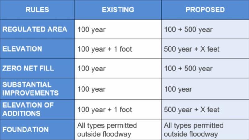 Houston's current code only applies to property in the 100-year floodplain and protects 1 foot above 100-year flood elevation. The proposed revisions would include property in the 500-year floodplain and protect "X feet" of 500-year flood elevation. It would also include no net fill in the 500-year floodplain.