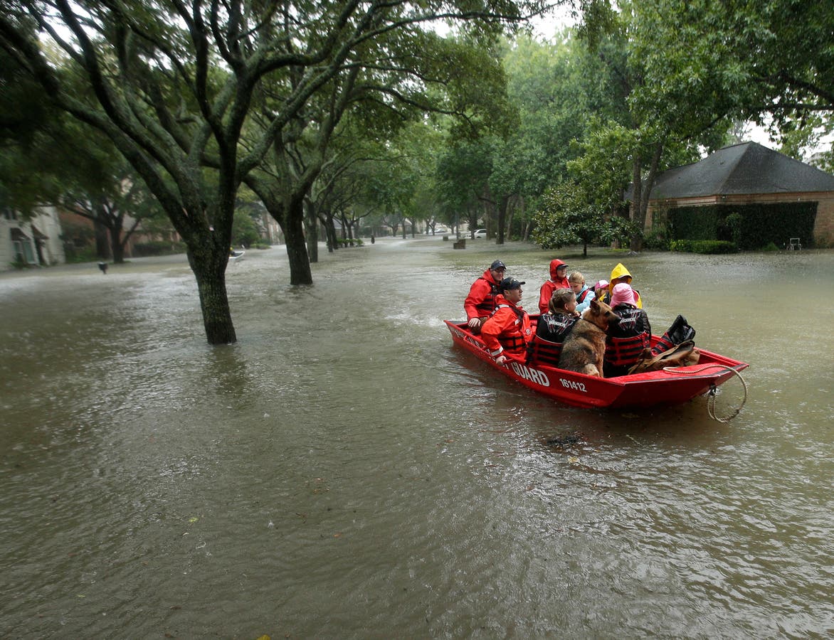 Rescued: A Coast Guard rescue team evacuates people from a neighborhood inundated by floodwaters from Tropical Storm Harvey on Monday, Aug. 28, 2017, in Houston, Texas. (AP Photo/Charlie Riedel)
