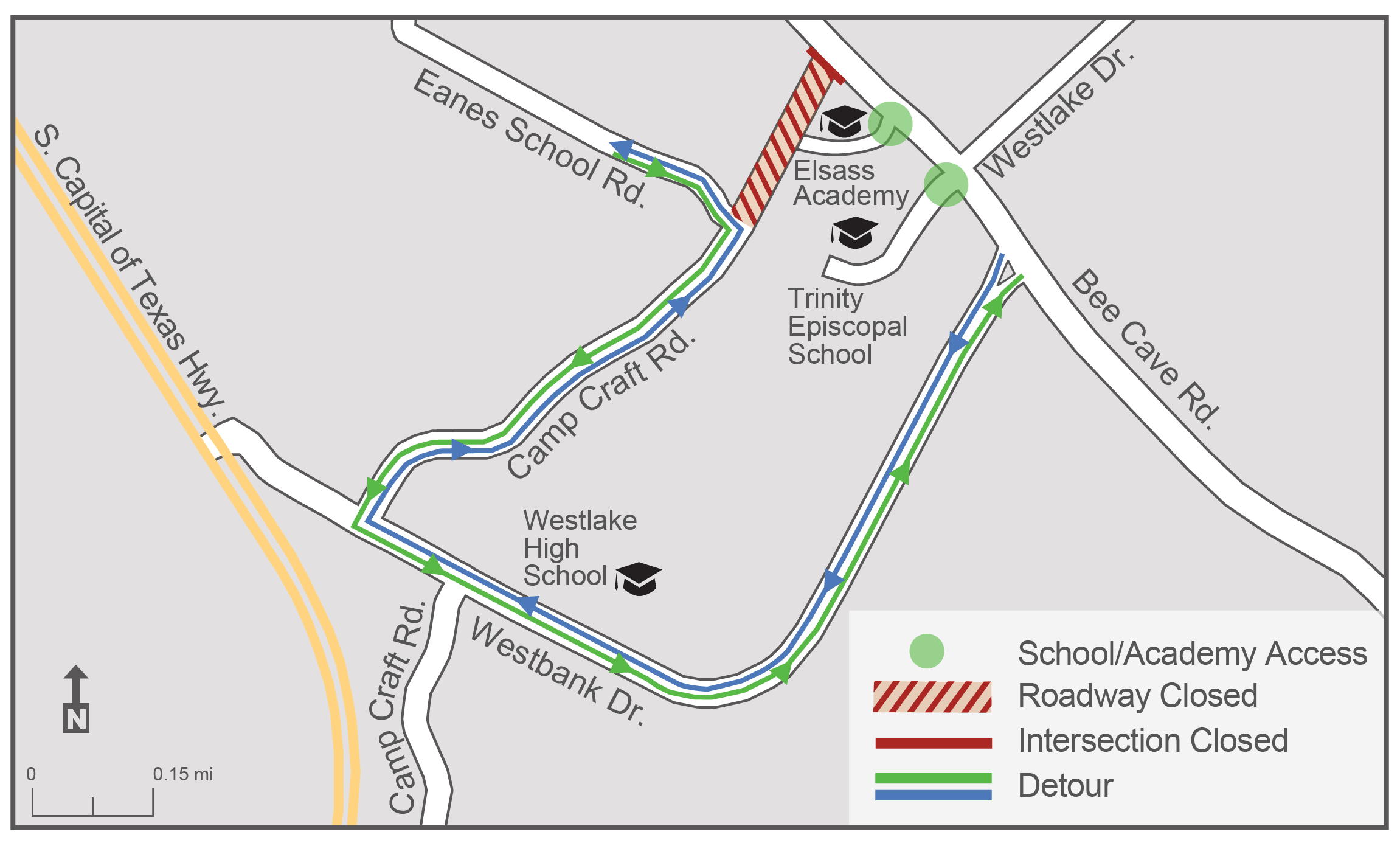 All traffic on Bee Cave Road wishing to access Camp Craft Road will be detoured to Westbank Drive, where drivers can access Camp Craft Road from the south. Drivers who need to access Elsass Academy Westlake and Trinity Episcopal School of Austin will need to do so via Bee Cave Road (see attached map). Access to all other properties and residential streets will be maintained. Camp Craft Road is anticipated to be re-opened to all traffic by mid-August, before the 2019/2020 school year begins, weather permitting.