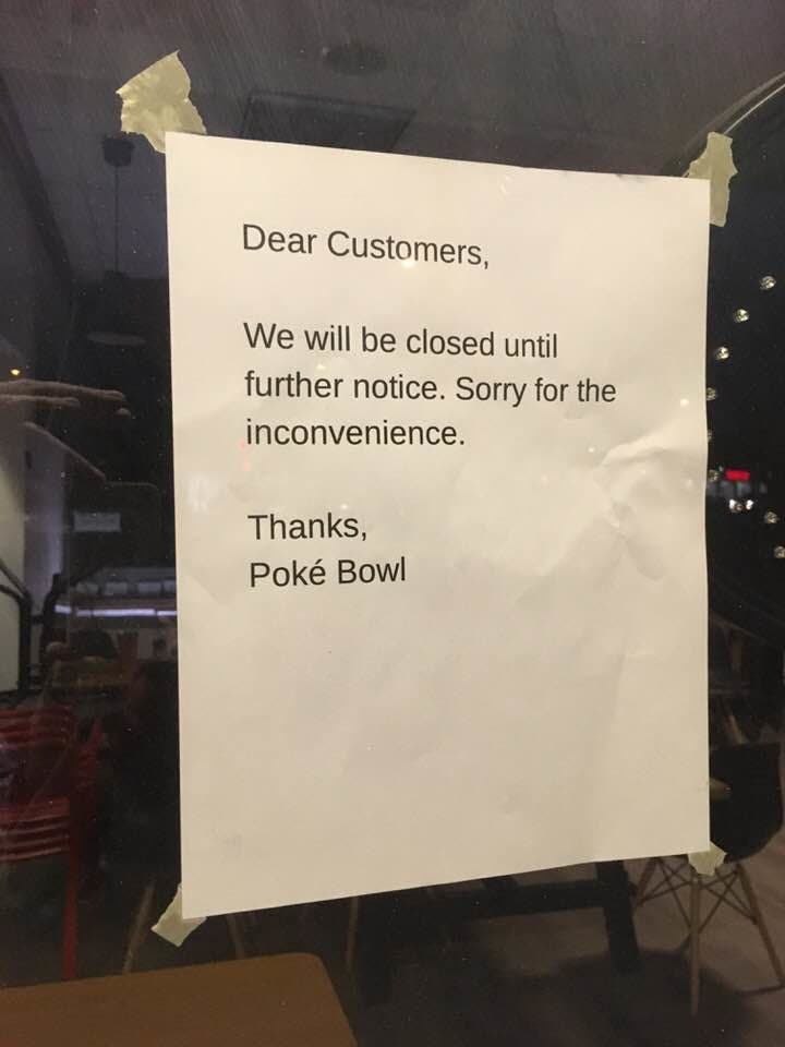 Regular patrons seeking their Poké fix were met instead with a closed storefront on Saturday evening, a note affixed to the window alerting to the temporary closure.