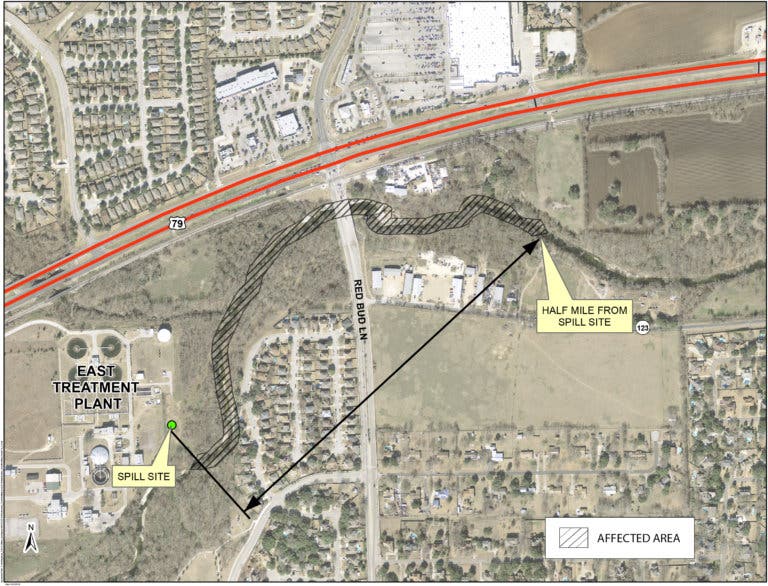 Here's how city officials described the breakdown: "The overflow was caused by a power failure in the electronic system that controls pumps at the site as well as the loss of backup power. As a result, all lift station pumps at the plant shut down. The overflow occurred at a manhole just outside a fence near the southeast corner of the plant, which is south of U.S. 79 and west of Red Bud Lane (County Road 122)."