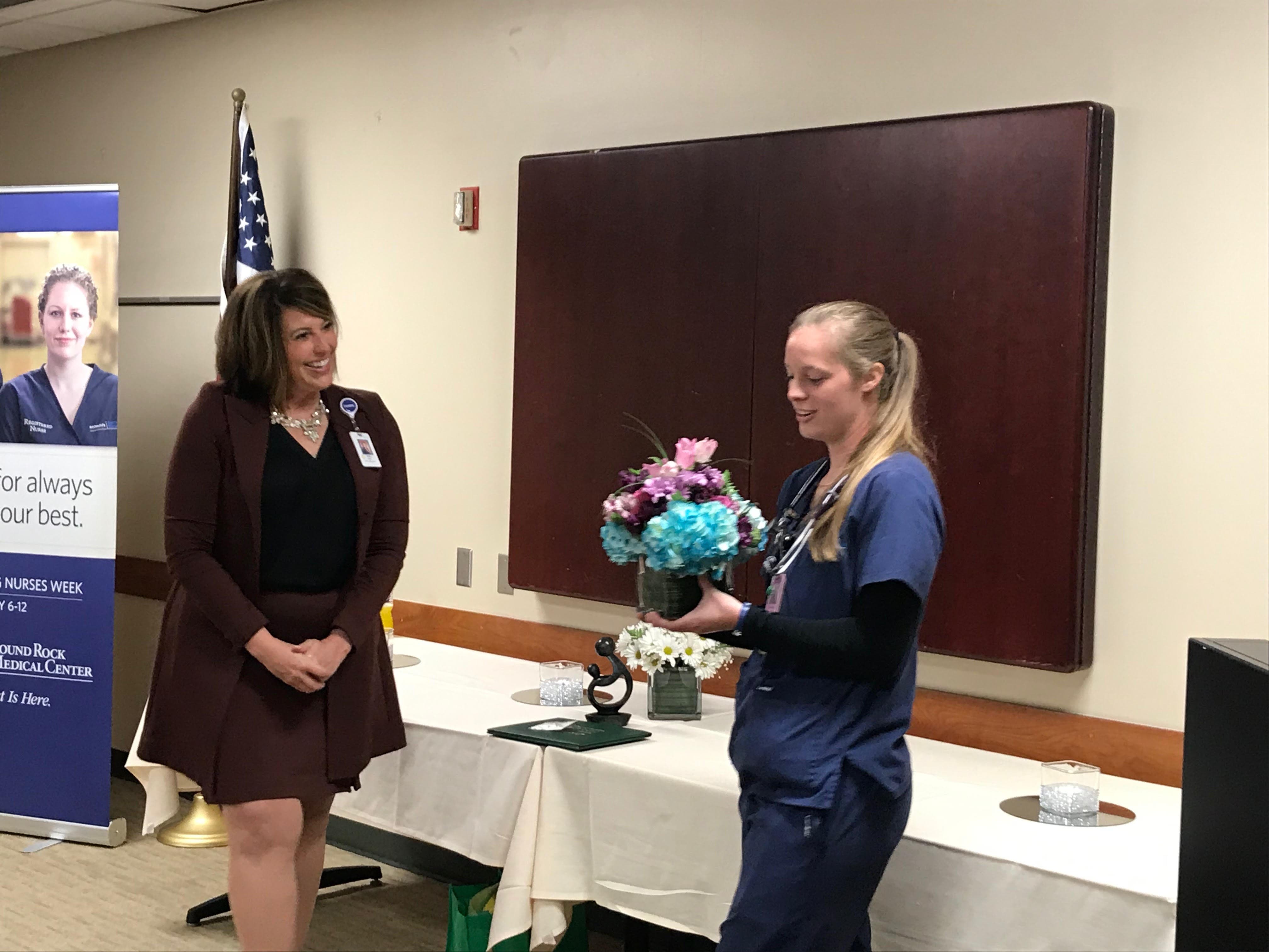 Haley Mendel receives flowers and a trophy for the hospital's Outstanding RN of the Year. Photo courtesy of St. David's Round Rock Medical Center.