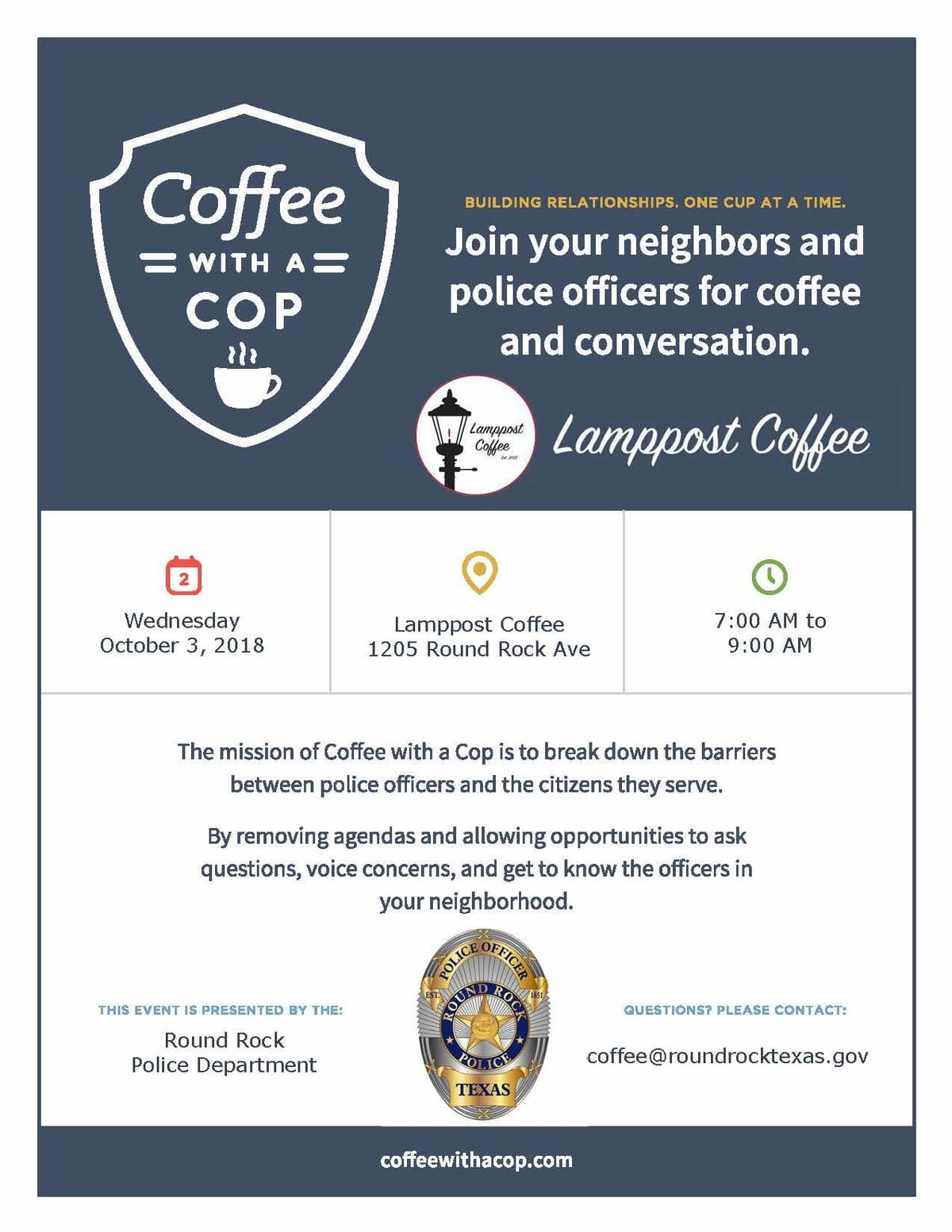 - Coffee with a Cop is scheduled Oct. 3 at the Lamppost Coffee shop, 1205 Round Rock Ave., offering a way of meeting your neighborhood police officers in a relaxed setting. Residents attending these regular gatherings are able to interact with officers while airing concerns or providing feedback. The next gathering is scheduled Wednesday, Oct. 3, from 7 a.m. to 9 a.m.