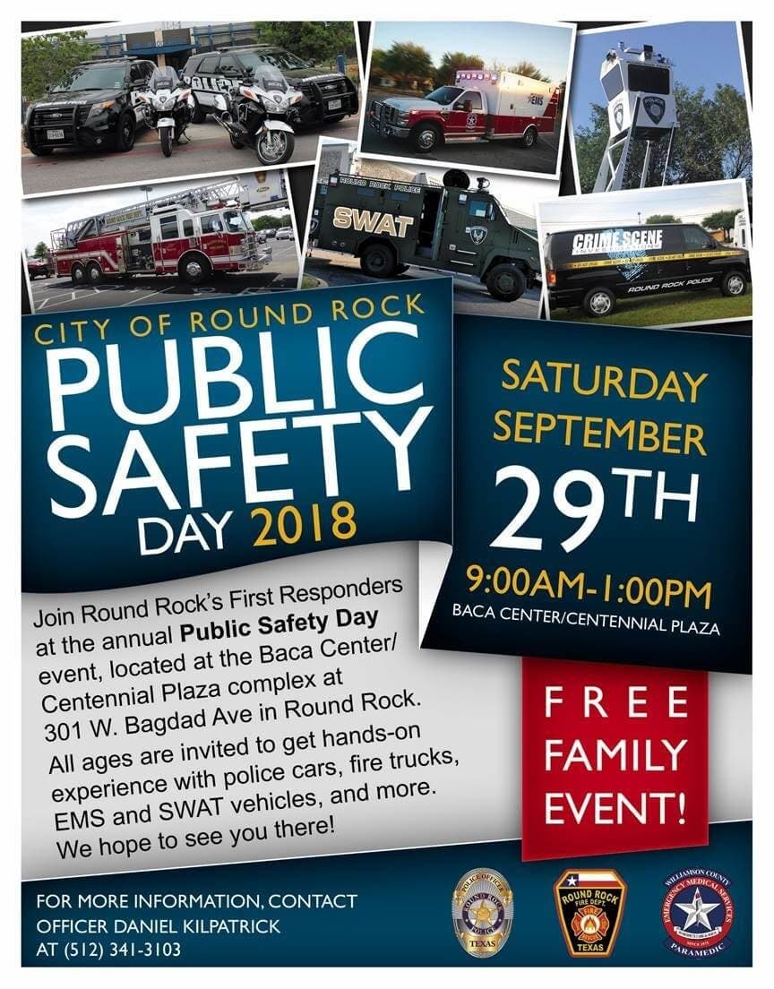 - On Sept. 29, Public Safety Day is scheduled. The free family event will feature demonstrations from fire officials, firefighters and EMS medics The Round Rock SWAT team, Traffic Unit, Crime Scene vehicles, Round Rock Fire engines, Hazmat, a live vehicle extraction, and more exciting public safety vehicles will be made accessible to kids of all ages. Plus, there'll be games, face painting, a photo booth, and more. Moreover, the Round Rock Noon Kiwanis Club will be hosting the 28th Annual Pancake Day inside the Baca Center which can only mean one thing: $5 for all-you-can-eat pancakes! The venue will be the Allen R. Baca, 301 W Bagdad Ave # 2We'll make sure to provide you with details as soon as they are made available.