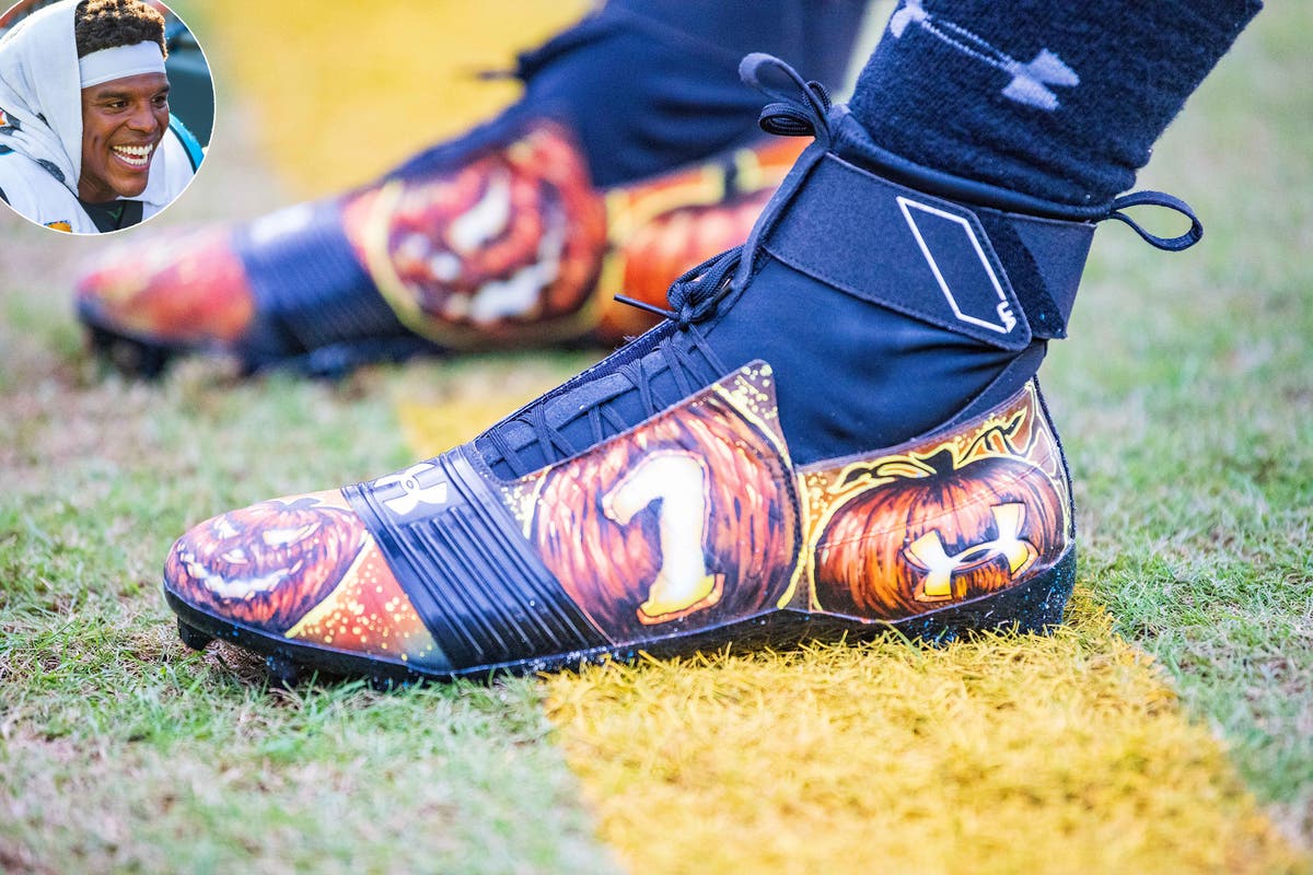 The Halloween-themed cleats of Carolina Panthers quarterback Cam Newton (1) before the NFL football game between the Baltimore Ravens and the Carolina Panthers on in Charlotte, NC.