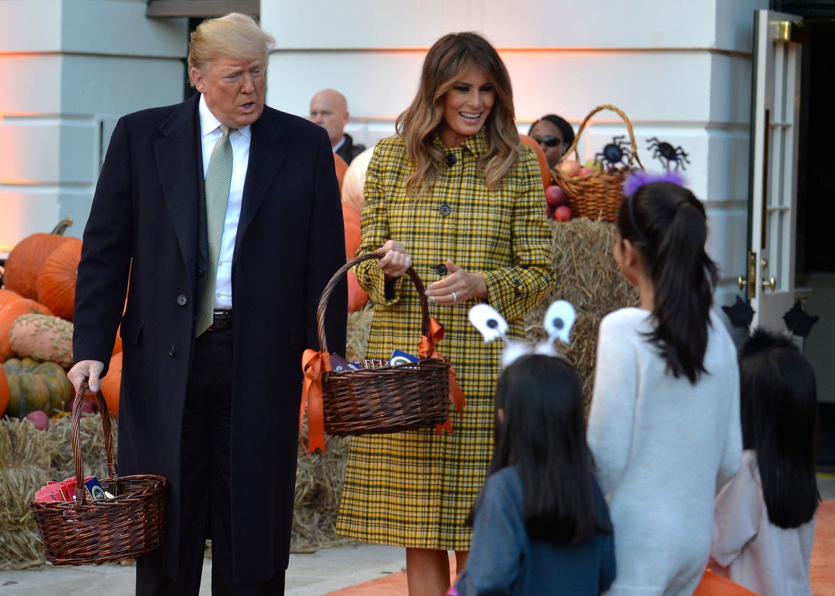 United States President Donald J. Trump and First Lady Melania Trump welcome trick-or-treaters to the White House for Halloween festivities, in Washington, DC.