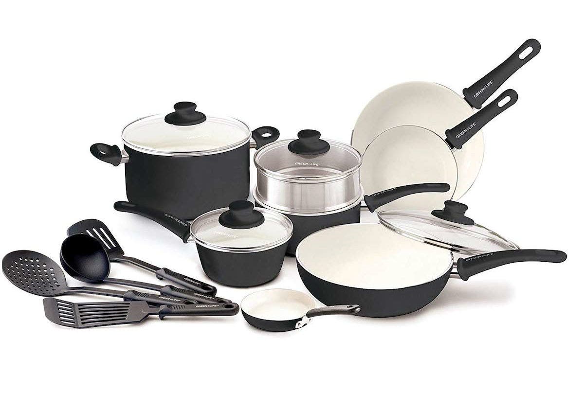 This set of oven-safe cookware includes a 4-inch mini frypan, a 7-inch open frypan, a 9.5-inch open frypan, a 1-quart covered saucepan, a 2-quart covered saucepan, a 5-quart covered stockpot, a 2.5-quart covered sauté pan, a 7-inch stainless steel steamer and 4 kitchen utensils. In other words, you'll be perfectly covered when it comes time to cook dinner.