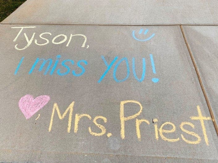 Alexis Priest has been missing the third-graders she teaches at a Georgia elementary school. She and her daughter have been leaving inspiring messages in chalk on sidewalks of their own neighborhood, and “it just kind of hit me,” she said. “It would be nice to let (my students) know,’hey, I’m still here.’ ” Read Jim Massara’s story on Loganville-Grayson Patch.