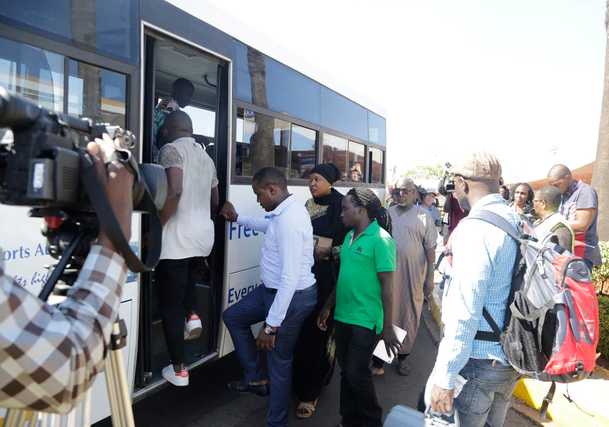 Relatives of the victims involved in a plane crash board a bus at Jomo Kenyatta International Airport, Nairobi, Kenya, on Sunday, to travel to a hotel to receive more information.