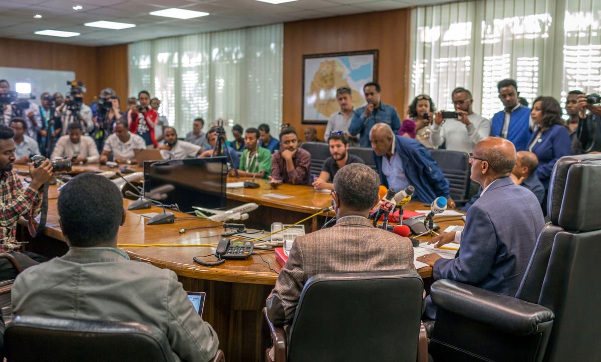 Ethiopian Airlines CEO Tewolde Gebremariam, seated right, holds a press briefing at the headquarters of Ethiopian Airlines in Addis Ababa, Ethiopia, Sunday.