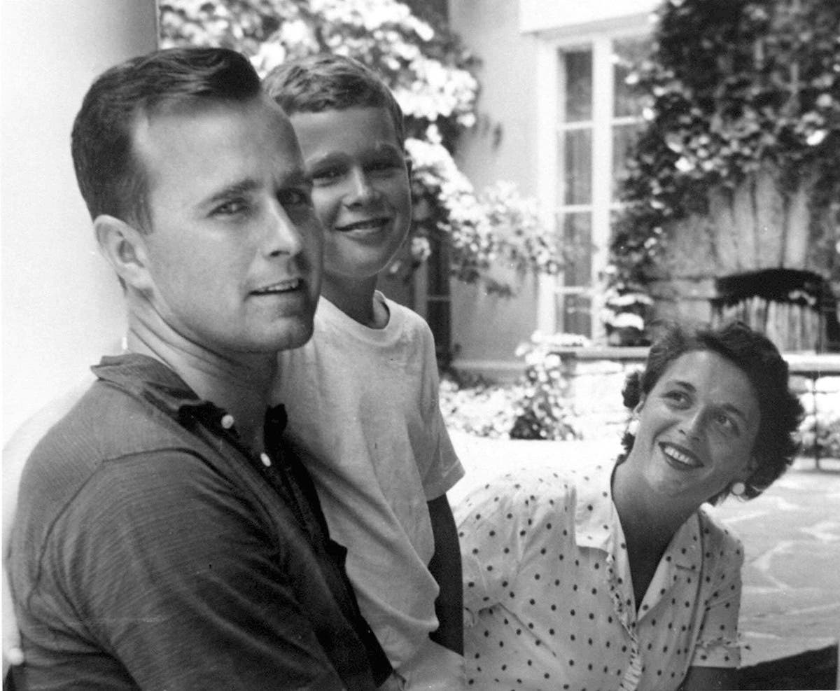 George H.W. Bush, left, and Barbara Bush pose with their son, George W. Bush, in Rye, New York. The Bushes were married Jan. 6, 1945, and have had the longest marriage of any presidential couple in American history. (George Bush Presidential Library via AP, File)