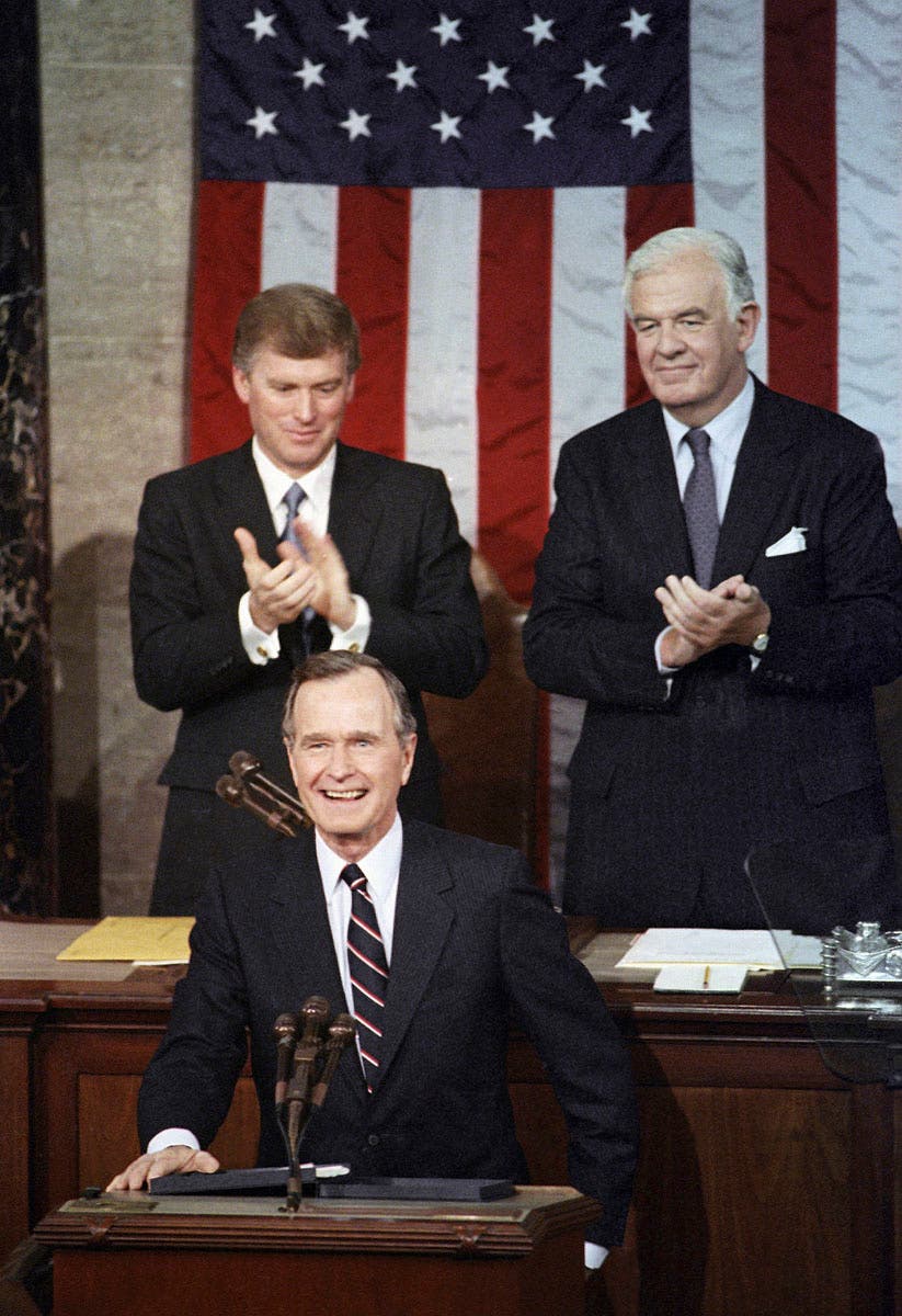 President George H.W. Bush receives applause from Vice President Dan Quayle, left, and House Speaker Thomas Foley prior to delivering his first State of the Union address on Capitol Hill in Washington. (AP Photo/Bob Daugherty, File)
