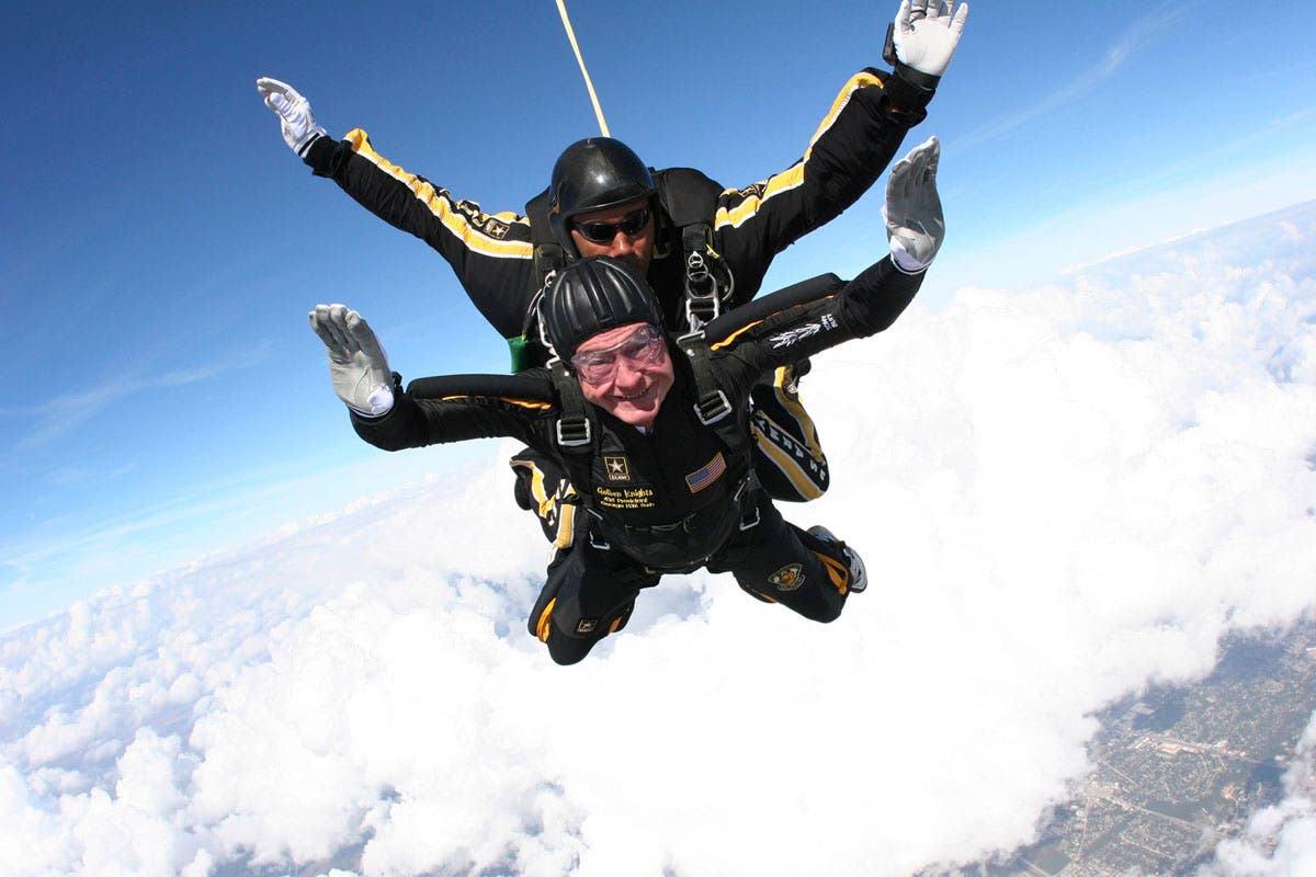 U.S. Army Golden Knights, former President George H.W. Bush free falls with Golden Knights parachute team member Sgt. 1st Class Mike Elliott, as he makes a dramatic entrance to his presidential museum during a rededication ceremony in College Station, Texas. (Sgt. 1st Class Kevin McDaniel/U.S. Army via AP, File)