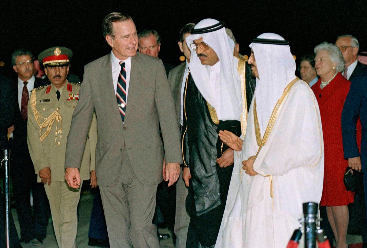 President George H.W. Bush is greeted by King Fahd as he arrives in Saudi Arabia. At right is first lady Barbara Bush. At center is an interpreter. (AP Photo/J. Scott Applewhite, File)