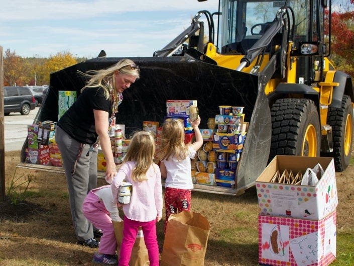 Little helpers were buzzing all over the campus of NHTI, Concord’s community college, on Tuesday as they helped fill a bucket loader with food for children in need in the Concord, New Hampshire, area.
