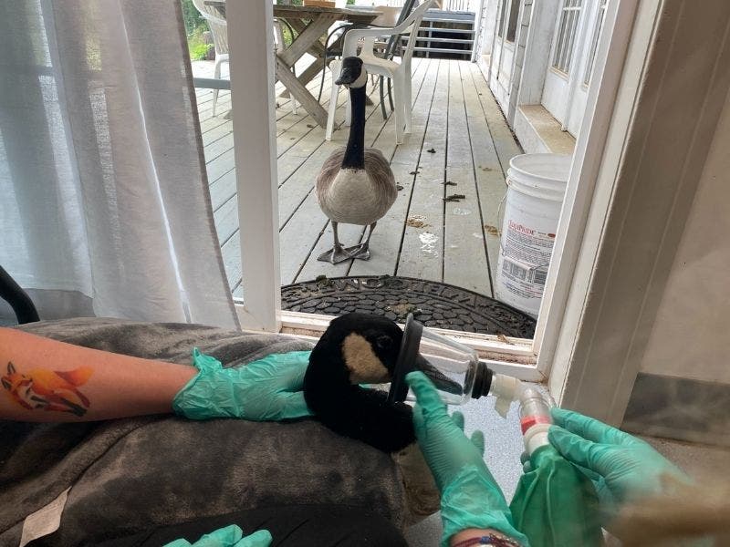 Inside was Arnold the goose, who was getting ready to undergo surgery. Outside was his mate, agitated that she couldn't get inside. Still, she refused to leave.