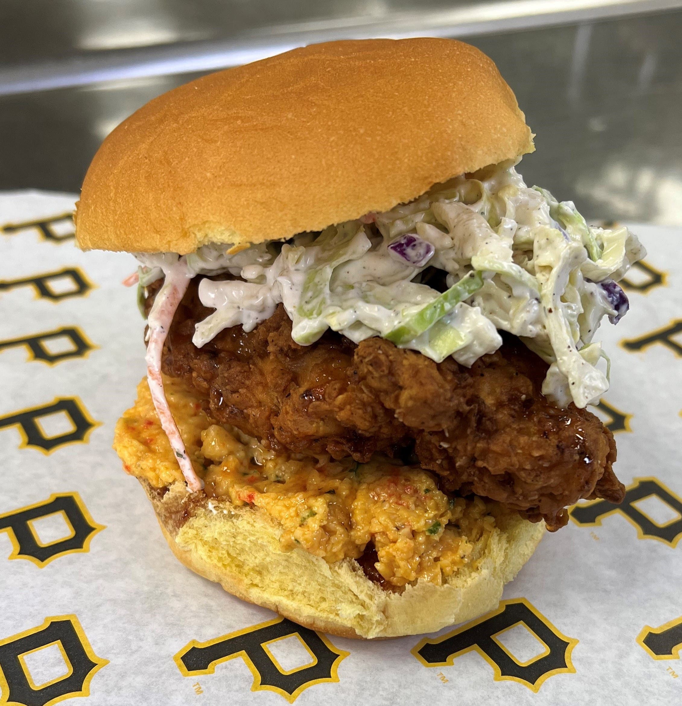 Served on a Martin’s roll, it is topped with a spicy scoop of scorching honey, pimento cheese and ranch slaw. An order of rooster tenders comes with crinkle-cut fries and Coop de Ville dipping sauces.