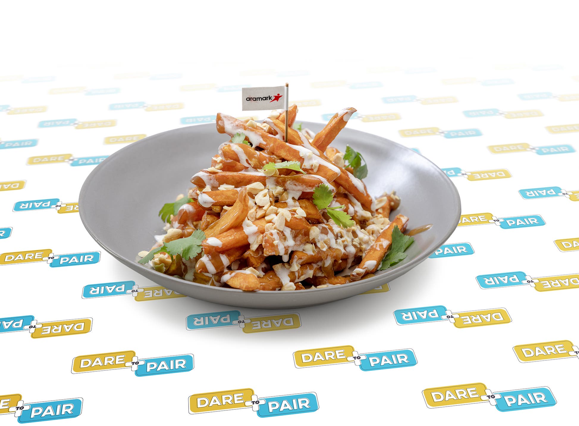 Sweet potato fries, crushed peanuts, cilantro, peanut sauce, topped with iconic fluff sauce.