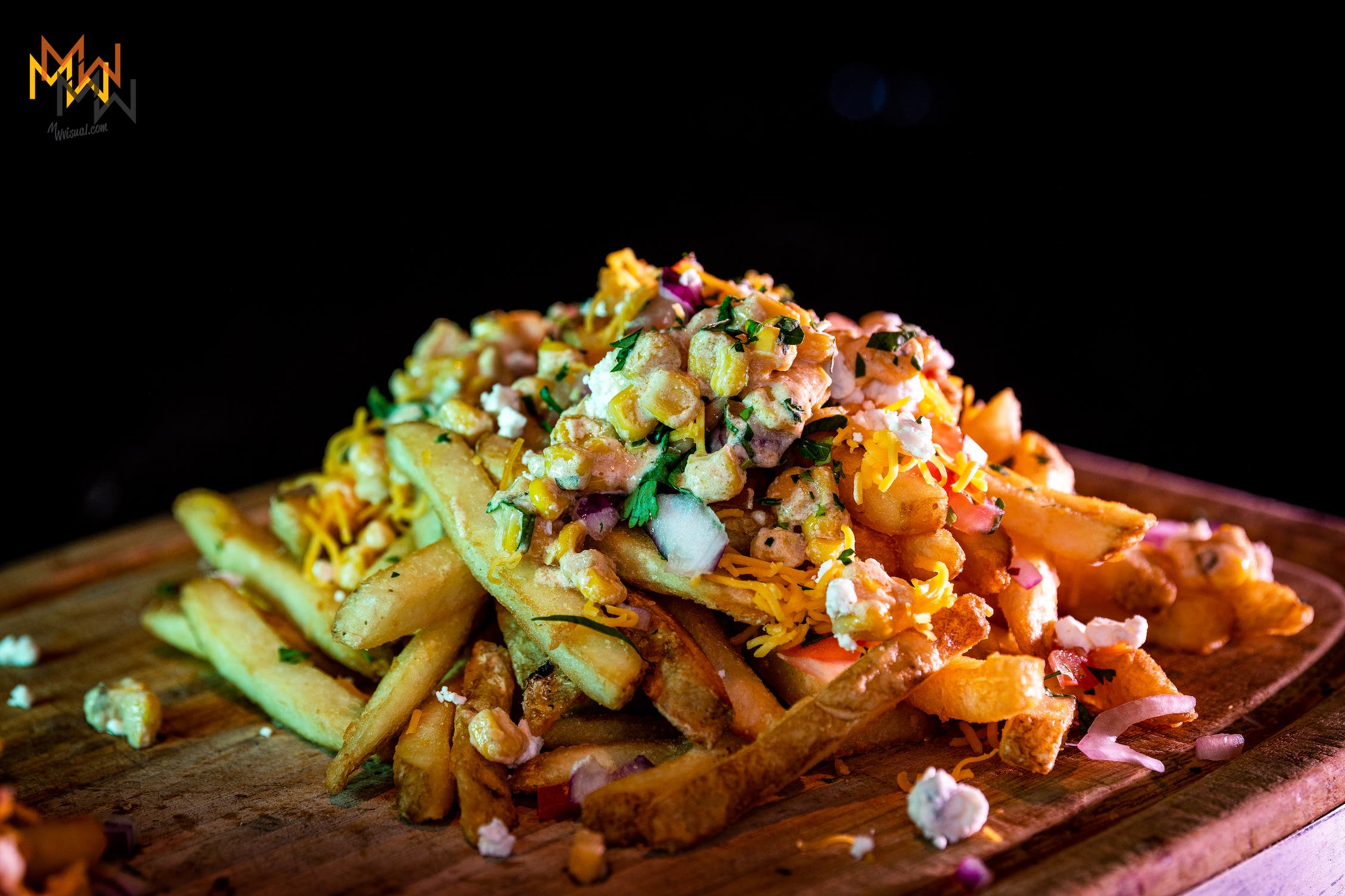 Beef carnitas, cheddar cheese, jalapeños, crema, elote, and pico de gallo on french fries.