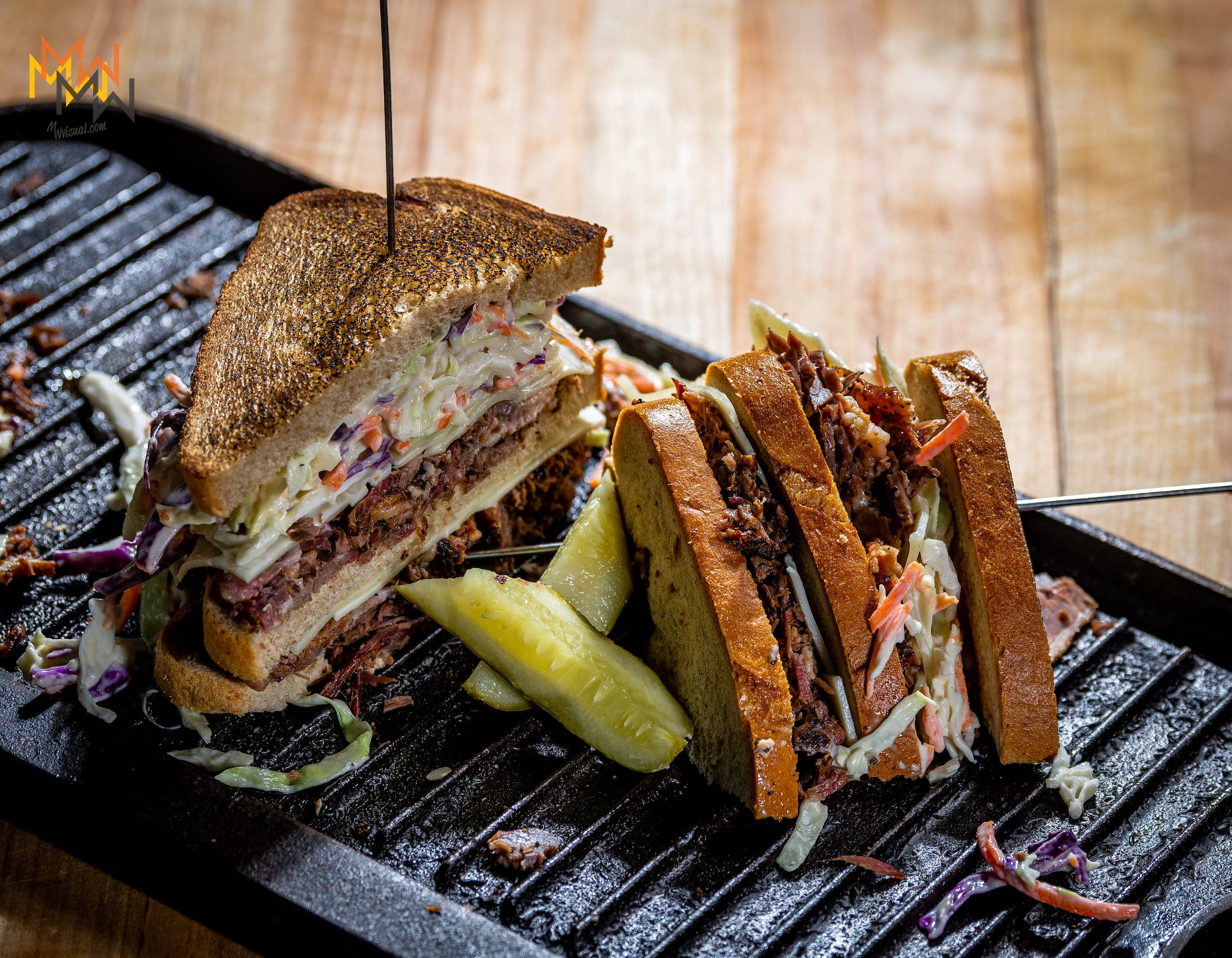 House-brined and smoked brisket with Swiss cheese, coleslaw, and house-made dressing on rye bread.