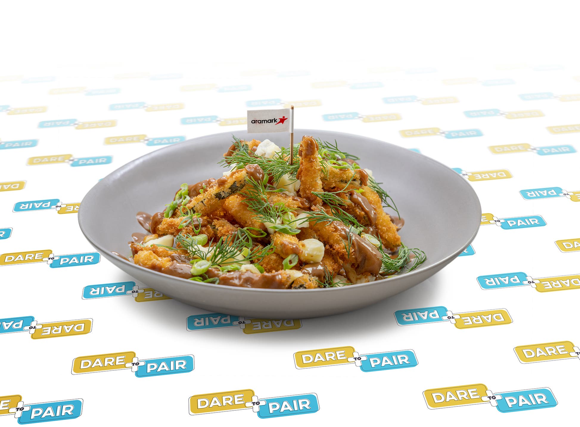 Fried pickle straws topped with peanut butter gravy, cheese curds, bacon bits and scallions? Sounds like a home run to us.