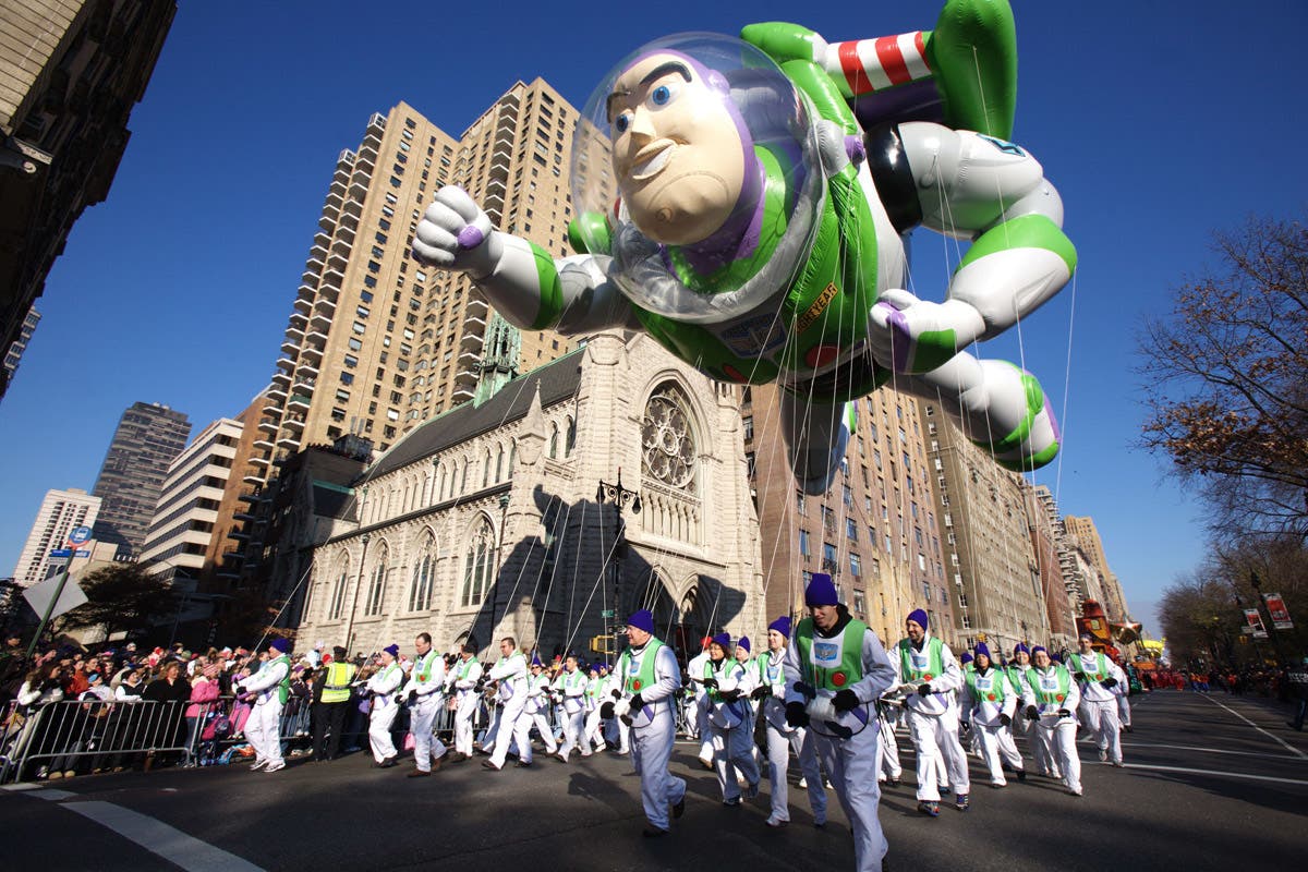 2008: The Buzz Lightyear balloon seen at the 82nd Macy's Thanksgiving Day Parade in New York. (Erik C. Pendzich/REX/Shutterstock)