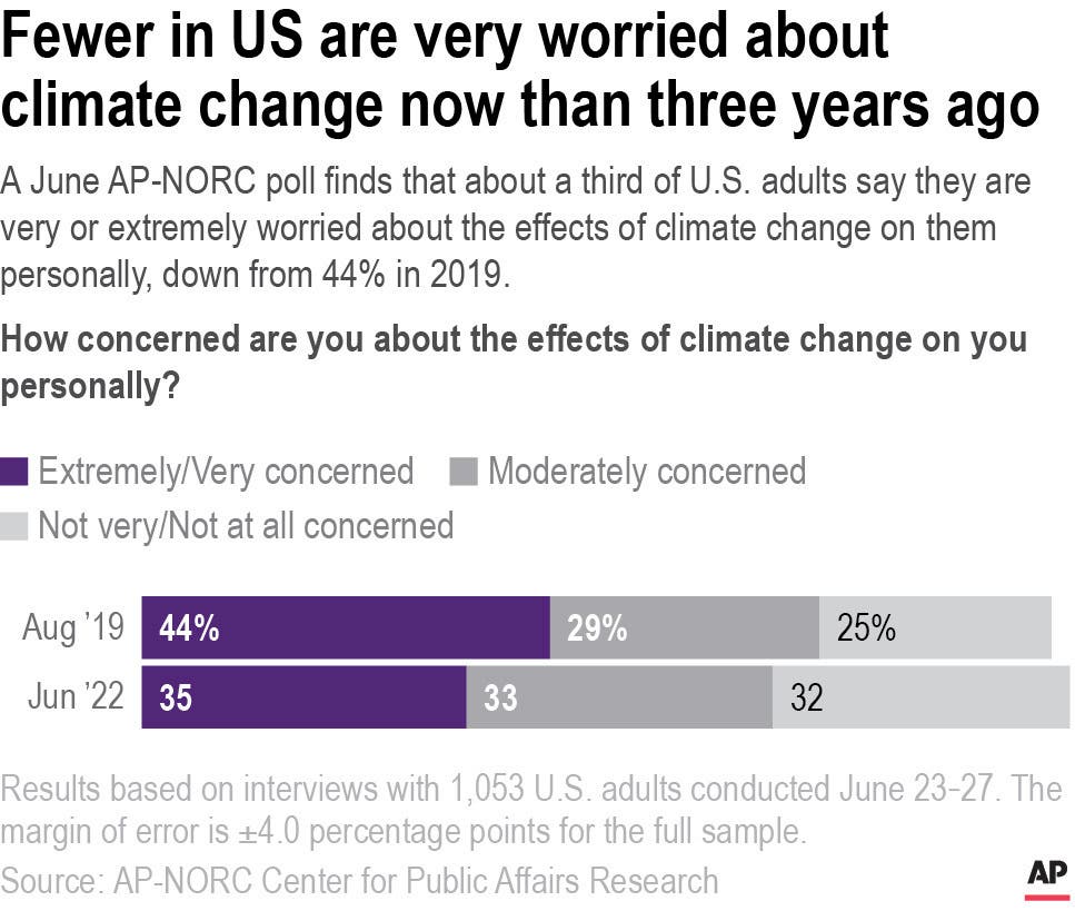 Many climate scientists told The Associated Press that the shifts are concerning but not surprising given that individuals are feeling overwhelmed by a range of issues, now including an economy plagued by inflation after more than two years of a pandemic. In addition to being outpaced by other issues, climate change or the environment are mentioned as priorities by fewer Americans now than just a few years ago, according to the poll.