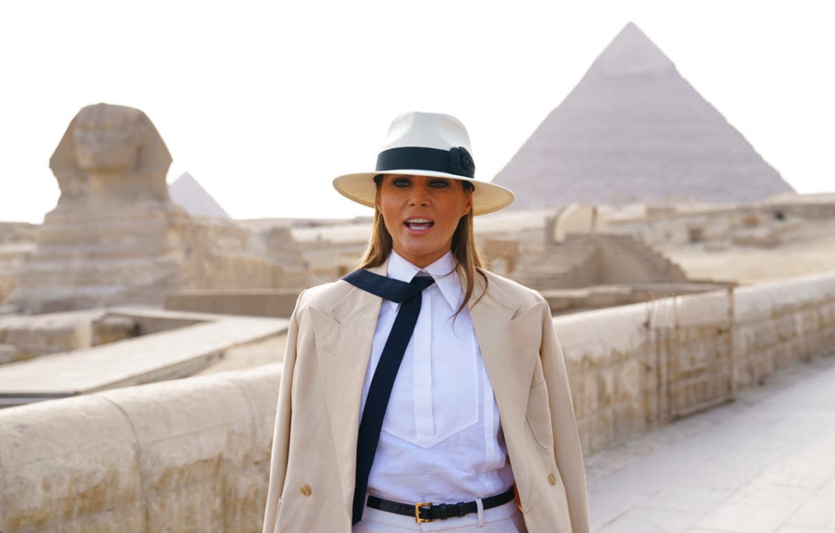 Image: U.S. first lady Melania Trump talks to media as she visits the ancient statue of Sphinx, with the body of a lion and a human head, at the historic Giza Pyramids site near Cairo, Egypt on Saturday, Oct. 6, 2018. Trump’s interview with ABC News on her first solo international trip will be broadcast Friday. (AP Photo/Carolyn Kaster)
