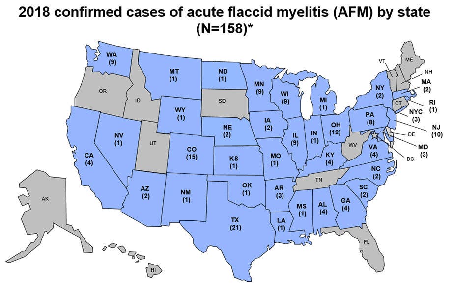 The states with the greatest number of AFM cases this year are Texas (21) and Colorado (15), but the state tallies may not truly represent where the illnesses are happening. Colorado was hit hard in the 2014 outbreak, and doctors there may simply do a better job of diagnosing the illness, the CDC said.