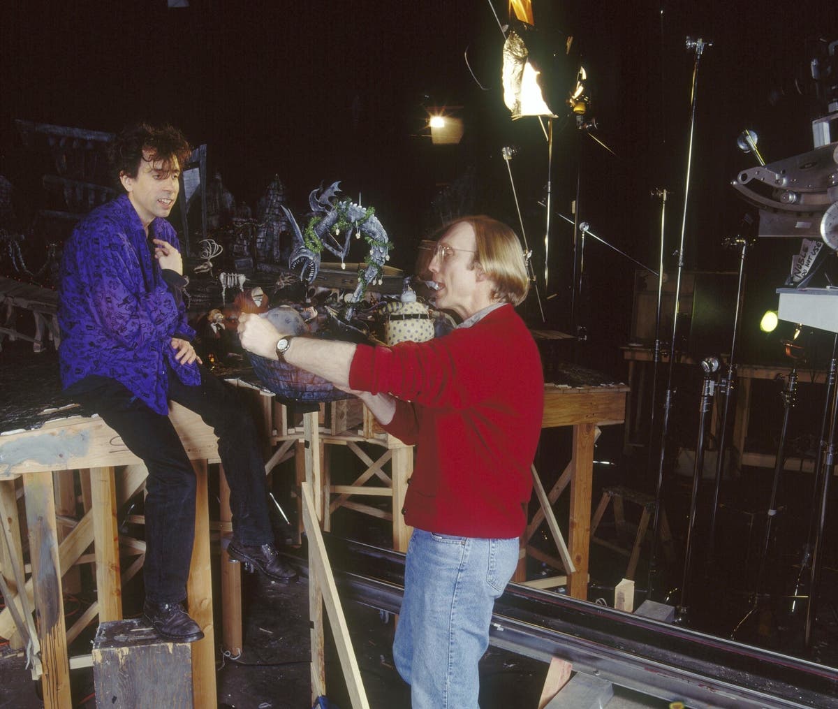 Tim Burton, mastermind behind "The Nightmare Before Christmas," seen in 1993 next to his iconic characters.