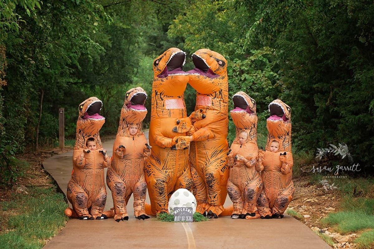 DALLAS, TX — A Dallas family has captured headlines around the U.S. after their dinosaur-themed baby announcement went viral on Facebook. The idea for her family to wear the popular inflatable T-Rex costumes came from Nicole Berkley in February after she suffered a miscarriage, Berkley wrote on Facebook.