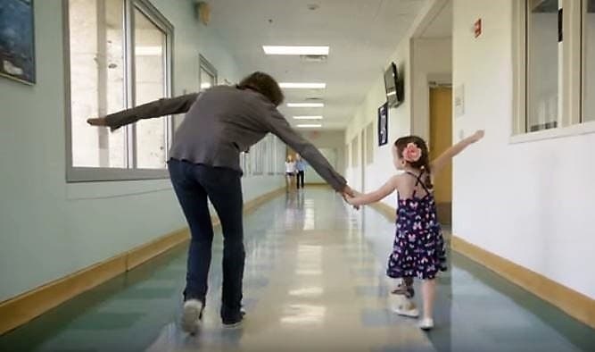 The video concludes with a group of children from the hospital joining Hansen on stage for a chorus of the popular song.