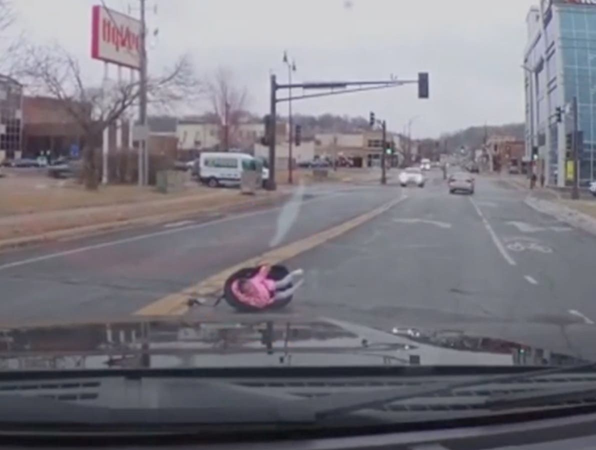 Video from a dashcam shows the child falling into the road while strapped into a safety seat.