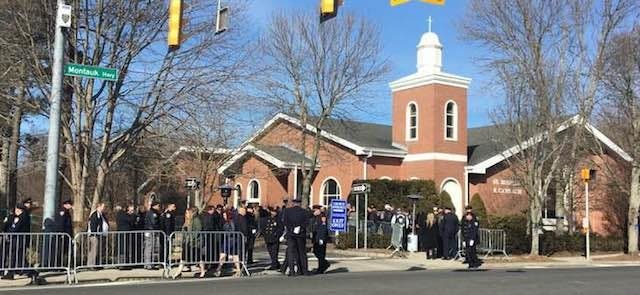 After waiting outside below heat lamps on the blustery cold day, police officers, friends and loved ones stepped into the Church of St. Rosalie on E. Montauk Hwy., where large screens projected images from Simonsen's beautiful life, photos of the man loved by so many surrounded by his wife and family, many friends, and fellow officers in blue — a man who was always, always smiling.