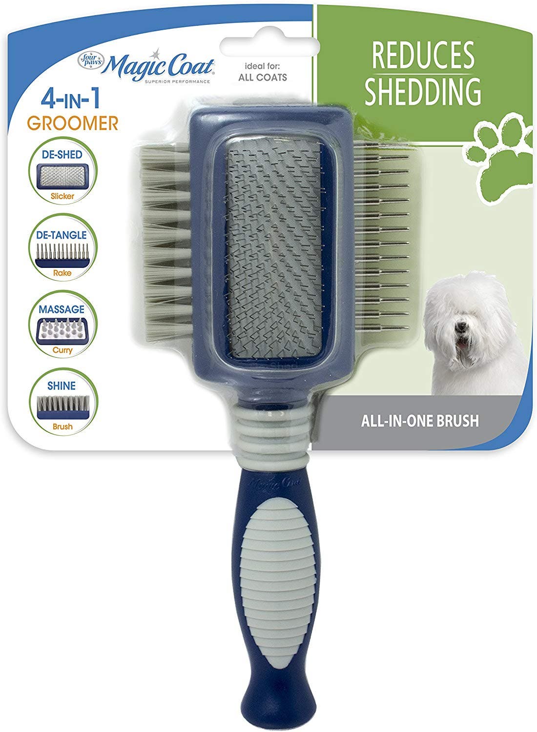 This all-in-one grooming tool has a slicker, curry, rake and bristle brush. Use it to loosen mats, massage away dirt, detangle loose hair, reduce shedding and leave your pup with a smooth, sleek coat. Each side of the brush is labeled to make the grooming steps simple.