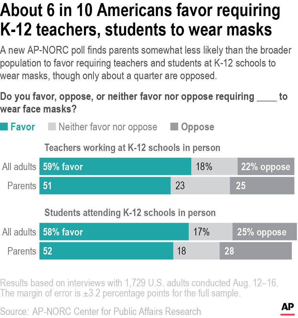 About 6 in 10 Americans say students and teachers should be required to wear face masks while in school, according to a poll from The Associated Press-NORC Center for Public Affairs Research. Similar shares say teachers and eligible students should also be required to receive a COVID-19 vaccine.