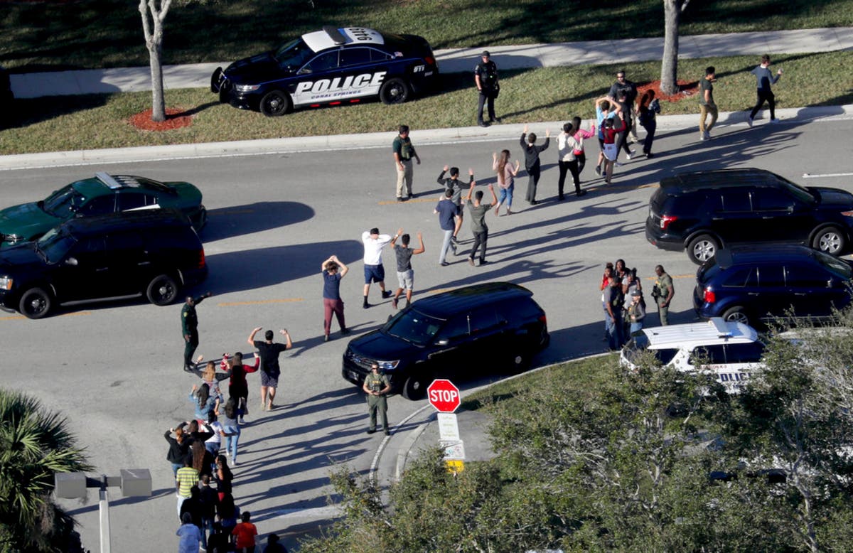In this Feb. 14, 2018, file photo, students hold their hands in the air as they are evacuated by police from Marjory Stoneman Douglas High School in Parkland, Fla., after a shooter opened fire on the campus. Emergency calls from parents and students during the Florida high school massacre show 911 operators at first trying to grasp the enormity of the emergency and then calmly trying to gather information to assist arriving law enforcement officers. The officers arrive to find chaos as delays allowed the shooter to flee. (Mike Stocker/South Florida Sun-Sentinel via AP, File)