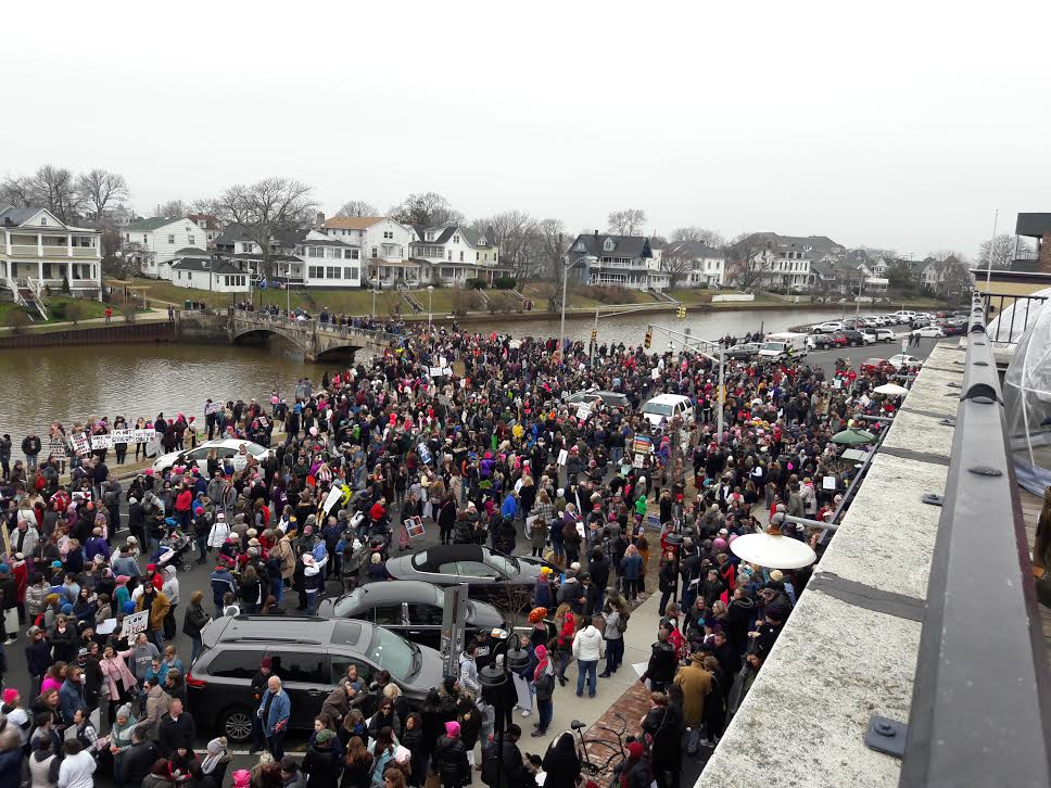 In Poughkeepsie, New York more than 4,000 people from all over the Hudson Valley turned out to march Saturday morning in the Poughkeepsie Women's March. Women, men and children walked the length of the Walkway Over the Hudson, a linear state park created out of an abandoned railroad bridge, to the Ulster County side and back to the Dutchess County. They carried signs, wore pink knit caps and chanted and sang for the duration.