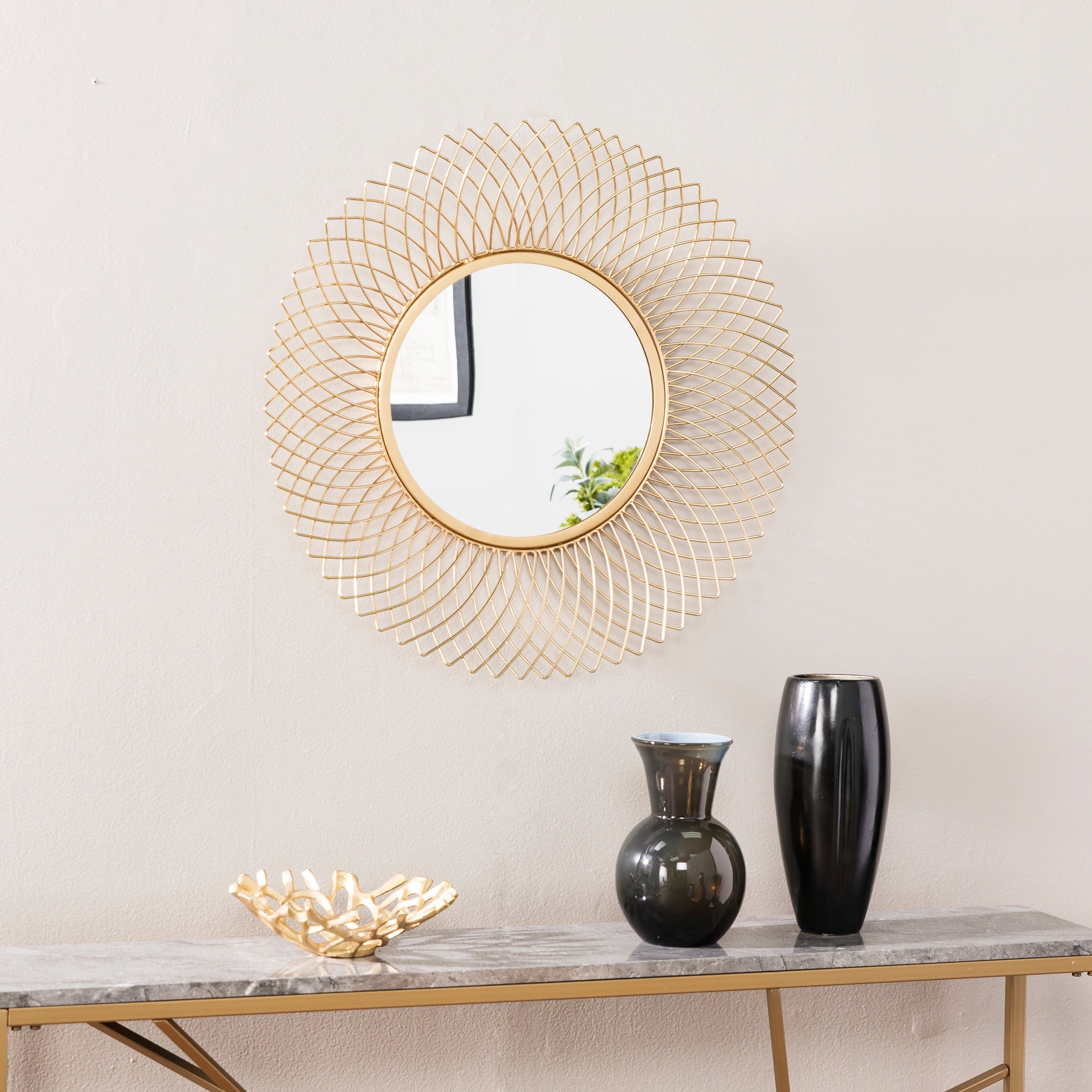 This contemporary mirror would look great over the fireplace, in an entryway or as the main attraction on its own wall. It measures 26 inches in diameter and has a beautiful brass finish that shines with Art Deco appeal.