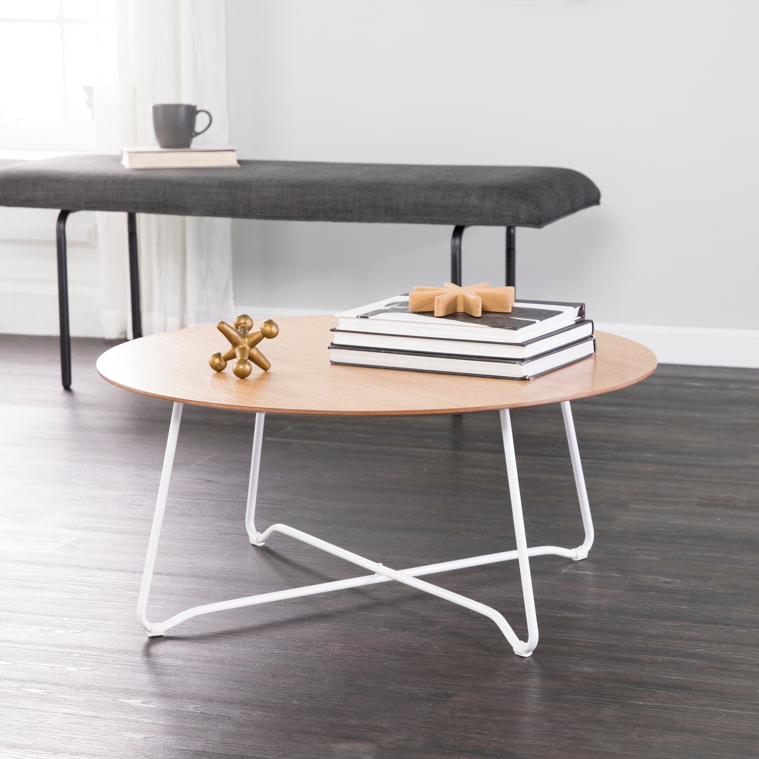 This minimalist coffee table is a modern take on the mid-century look. The white metal legs contrast with the natural-finished tabletop for a clean, visually appealing aesthetic. It measures 31.5.by-31.5-by-14-inches and can safely support up to 40 pounds.
