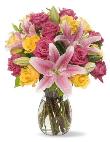 Who doesn't love receiving flowers? Mom will love this bunch of 18 stems — a mix of pink roses, yellow roses and oriental lilies. The flowers are shipped in bud form for optimal vase life, and blooms will open in 2-3 days. For this reason, we recommend opting for a Thursday or Friday delivery — that way mom's flowers should be in full bloom for her very special Sunday!