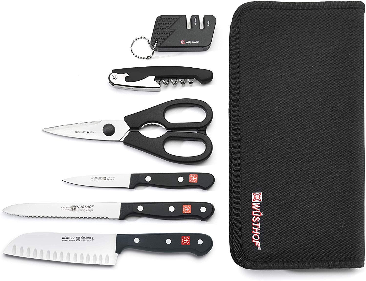 Wüsthof 8959 Gourmet Traveler's Set (59 percent off) — This 7-piece set includes a 3-inch spear point paring knife, a 5-inch serrated utility knife, a 6-inch hallow edge cook's knife, a waiter's corkscrew, come-apart kitchen shears and a picnic sharpener housed inside a convenient travel case.