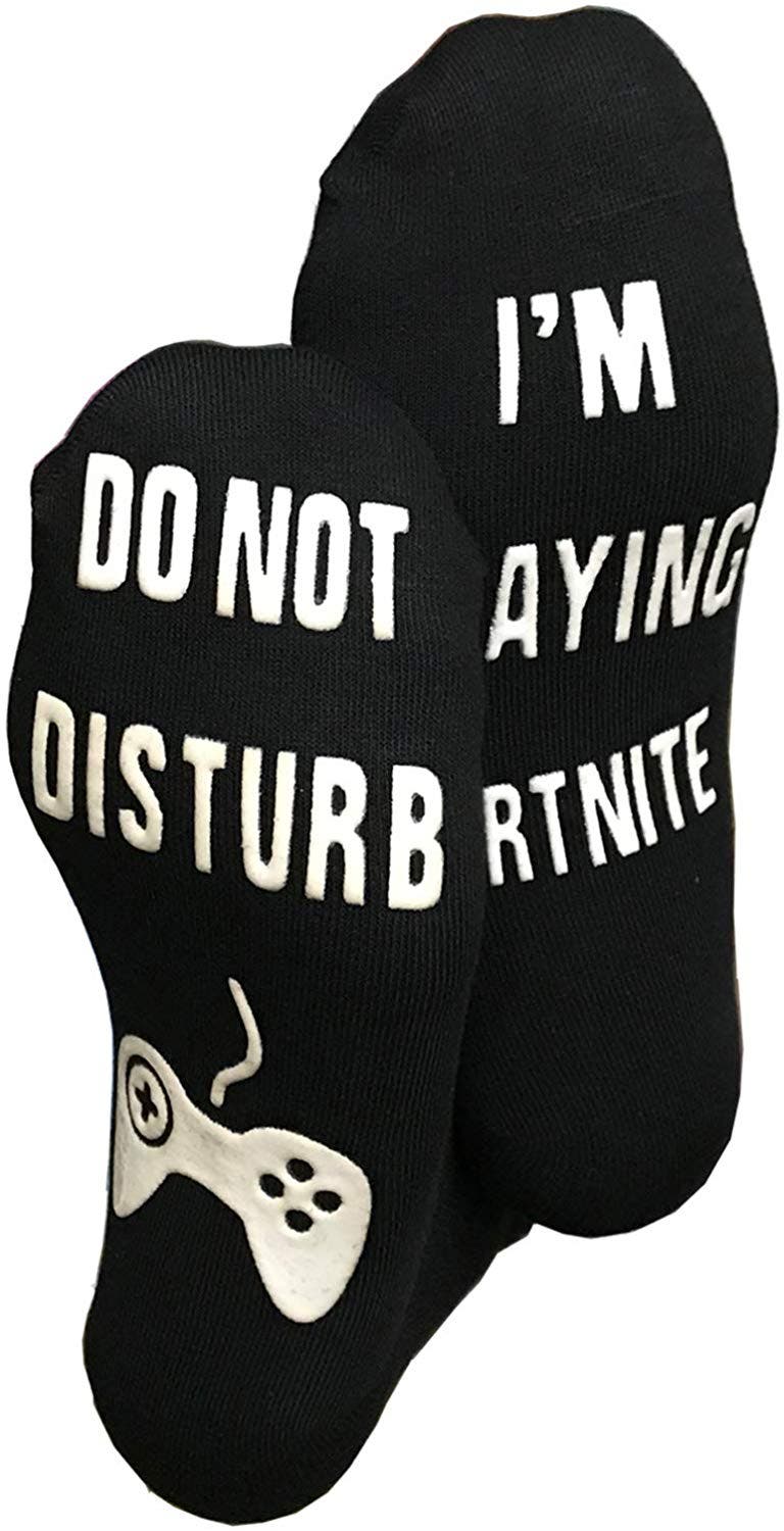 These "Please do not disturb, I'm busy playing Fortnite" socks send a clear message! They're made of a soft, super comfortable cotton-and-acrylic blend. One size fits most.