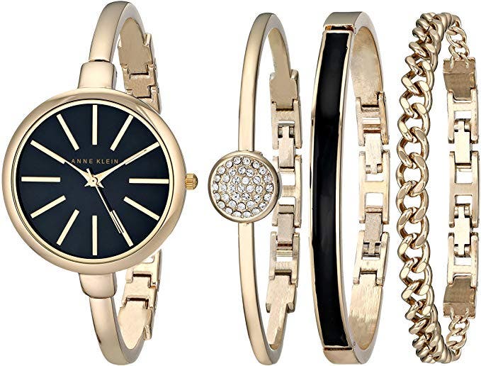 This timeless set will look dazzling on any woman's wrist. It includes a chain bracelet, a bangle with an enamel inlay, a bracelet with Swarovski crystal accents and a round watch featuring a black glossy dial. Together, these pieces are sure to dress up any outfit and add the perfect amount of sophistication.