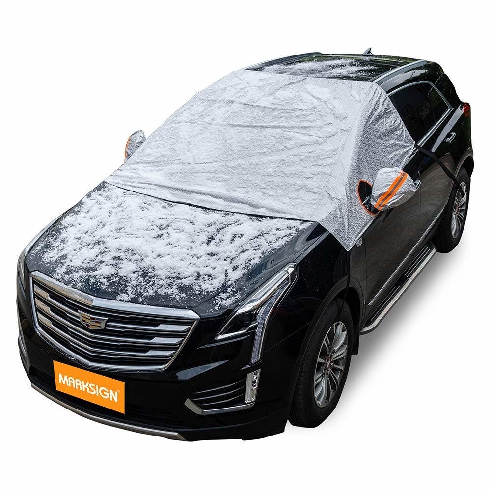 With this durable, all-weather windshield cover, you won't have to stand out in the cold scraping your windshield or wait around for it to defrost. It only takes a moment to put on and take off, and secures easily using rubber plastic hooks which attach to your wheels. This particular windshield cover is designed to fit all cars, compact and mid-sized SUVs, but for bigger trucks and vehicles, you'll want to get the large frost protector.